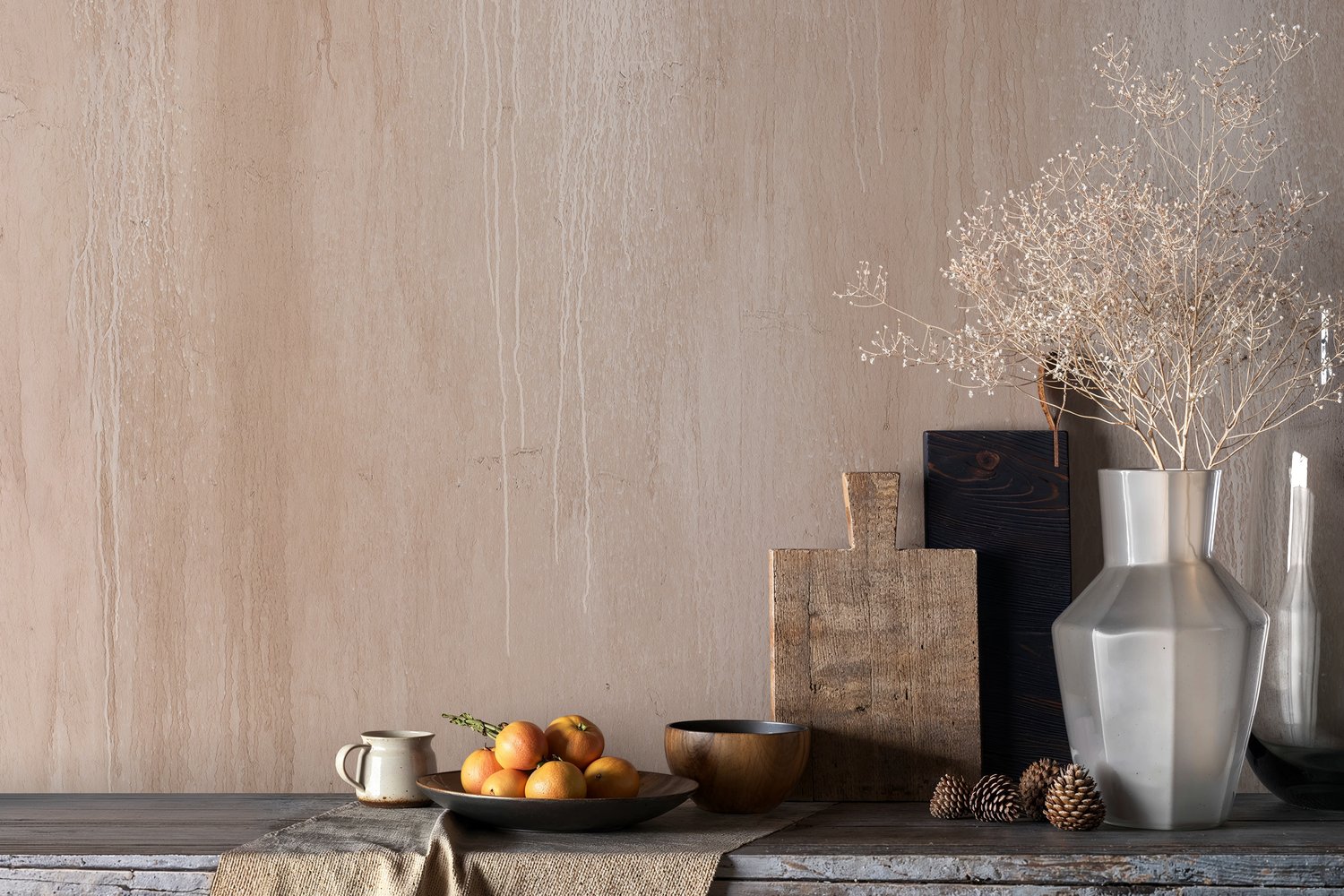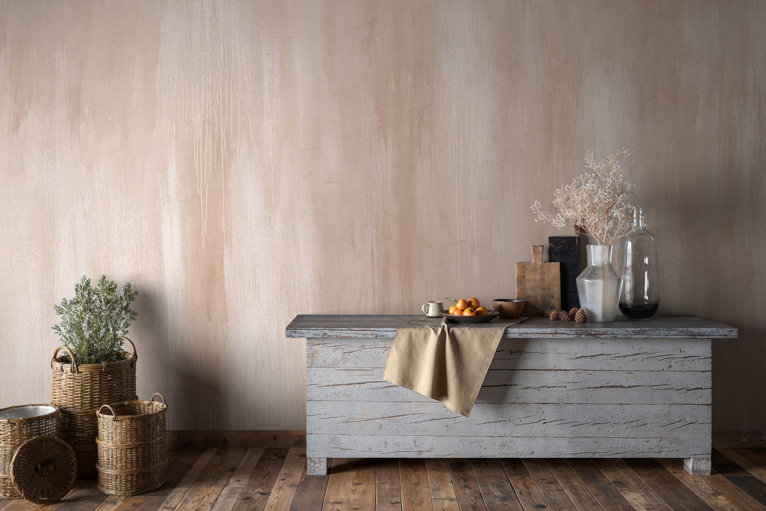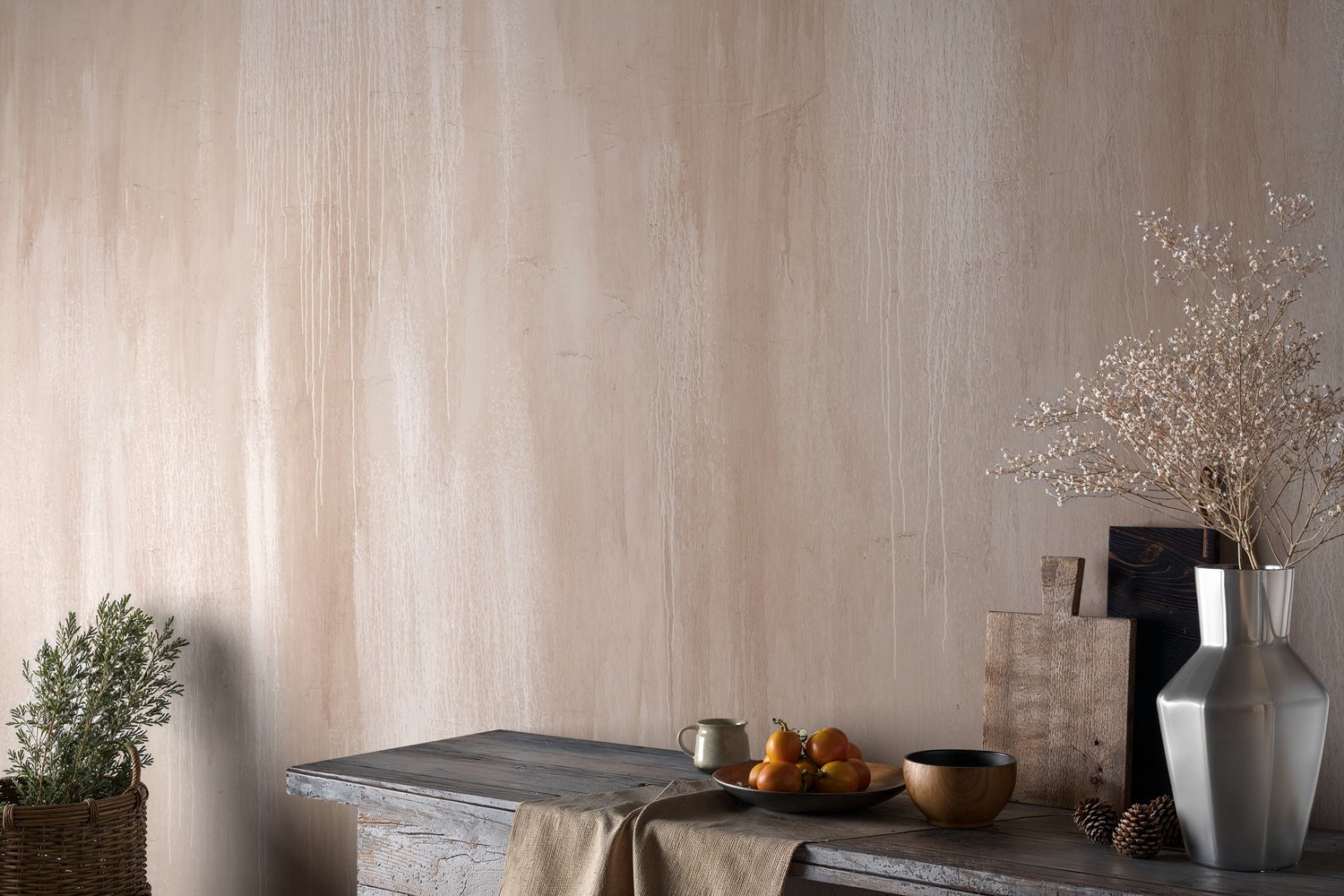The texture of the decorative plaster "Dripping Wall 01" evokes a different atmosphere than usual, with a touch of shabby chic that gives it a vintage and artisanal charm. The paint drips, delicately distributed on the surface, add an artistic element of dynamism and spontaneity where light tones overlap a comfortable warm background. The texture's appearance suggests a sense of continuous change and evolution as it plays with the concept of "imperfection" and "work in progress".