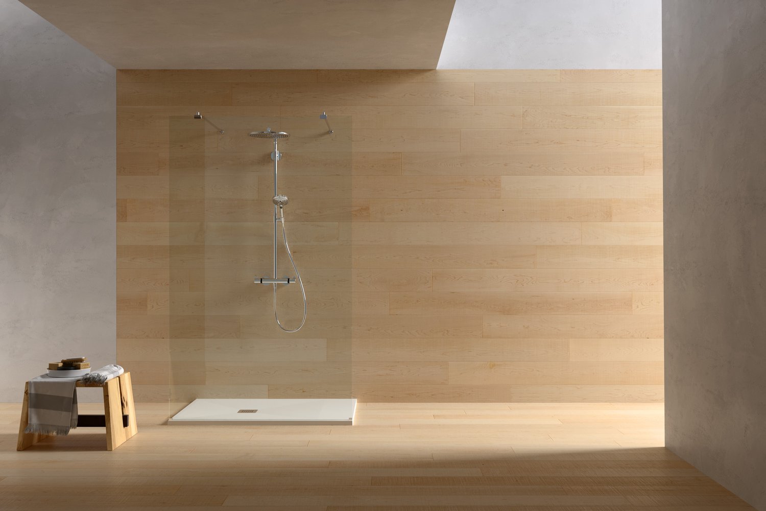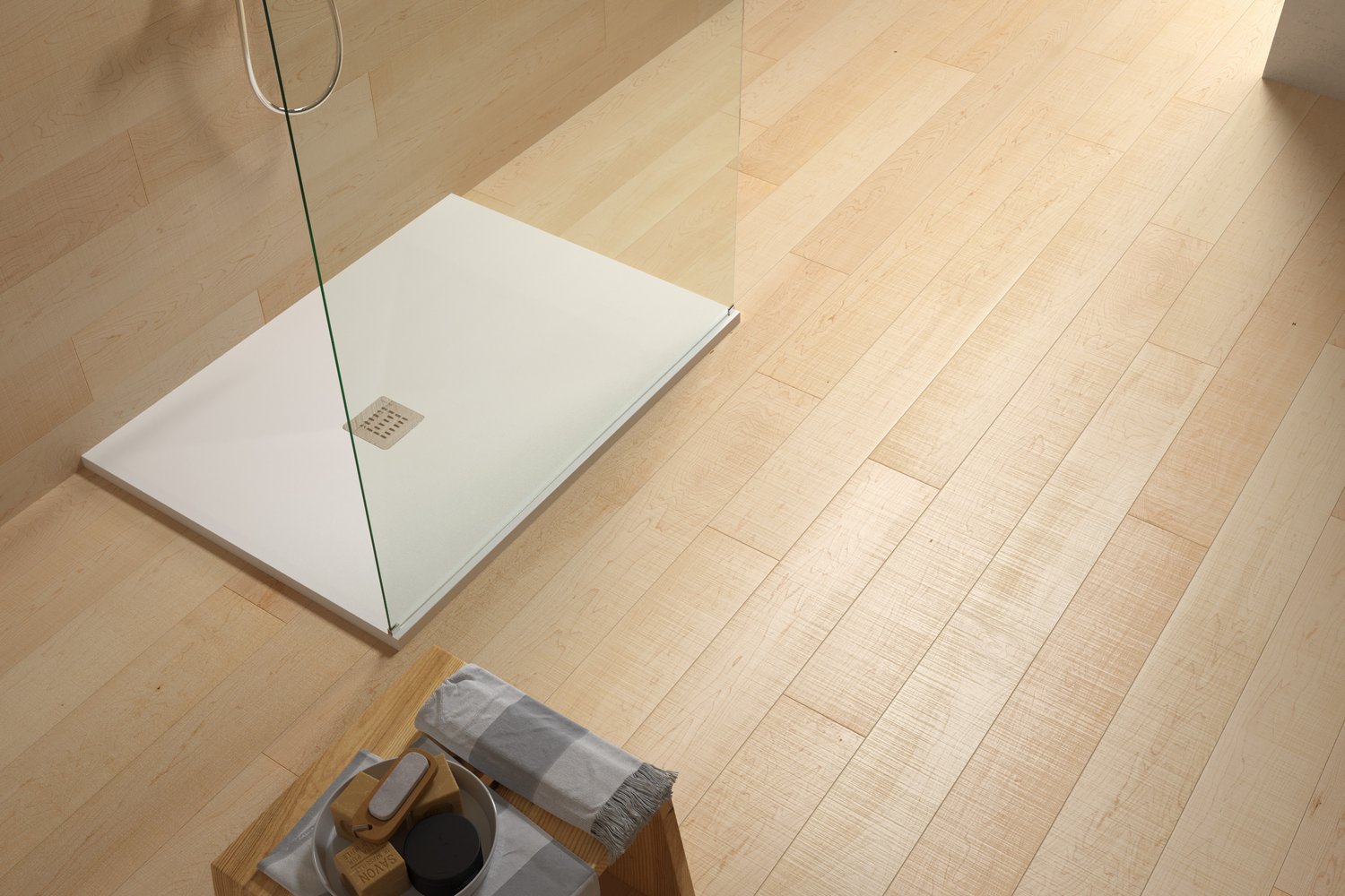 This wood features a pale tone and light chromatic shades, ranging from nearly white to an off-white cream color, occasionally exhibiting a reddish or golden hue. The grain typically runs straight but may also have a wavy pattern. The consistency of color across boards creates a seamless surface effect, making it well-suited for refined and sophisticated environments. It boasts a matte finish with a saw cut, a method that enhances the wood's natural characteristics and contributes to its distinct aesthetic.