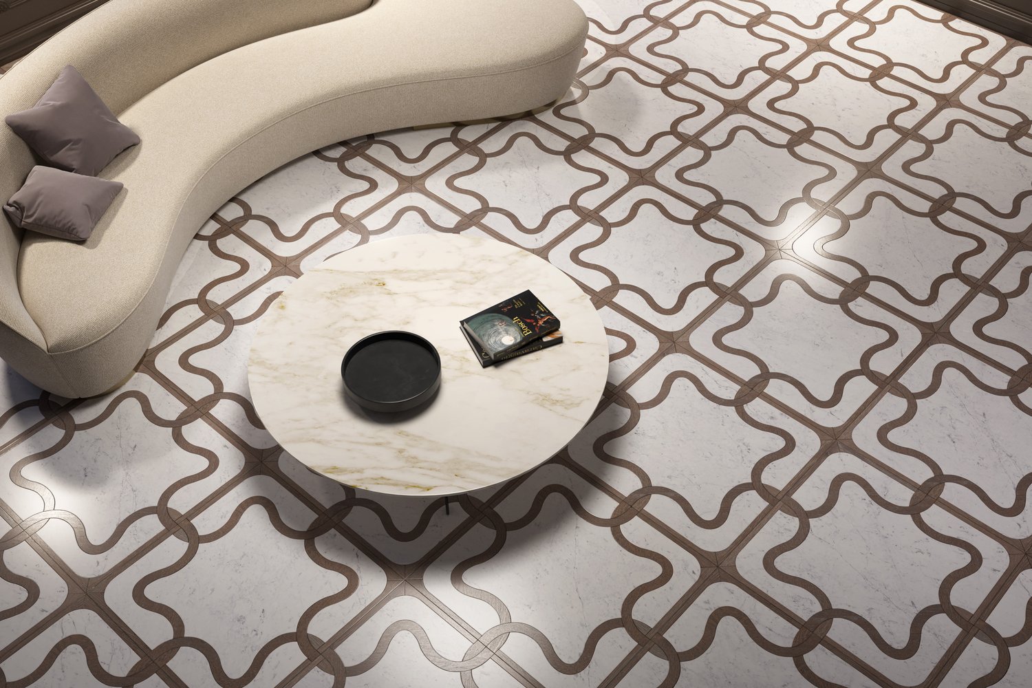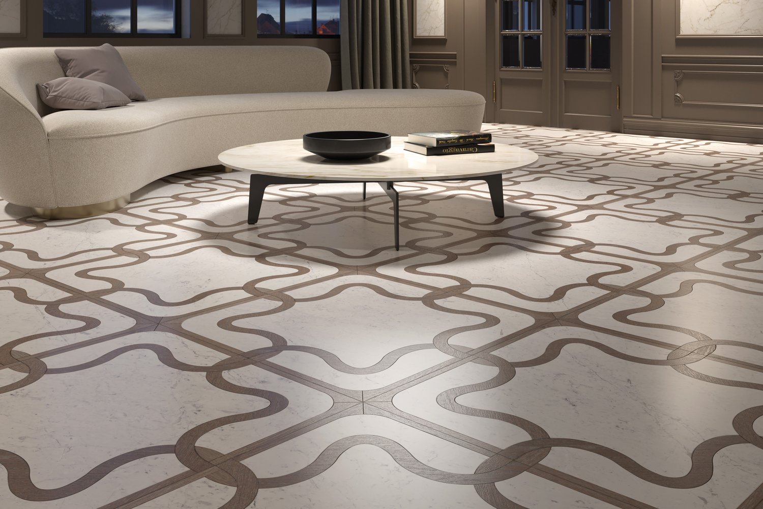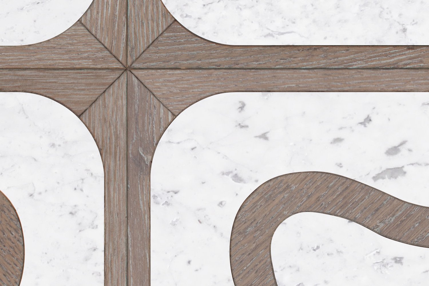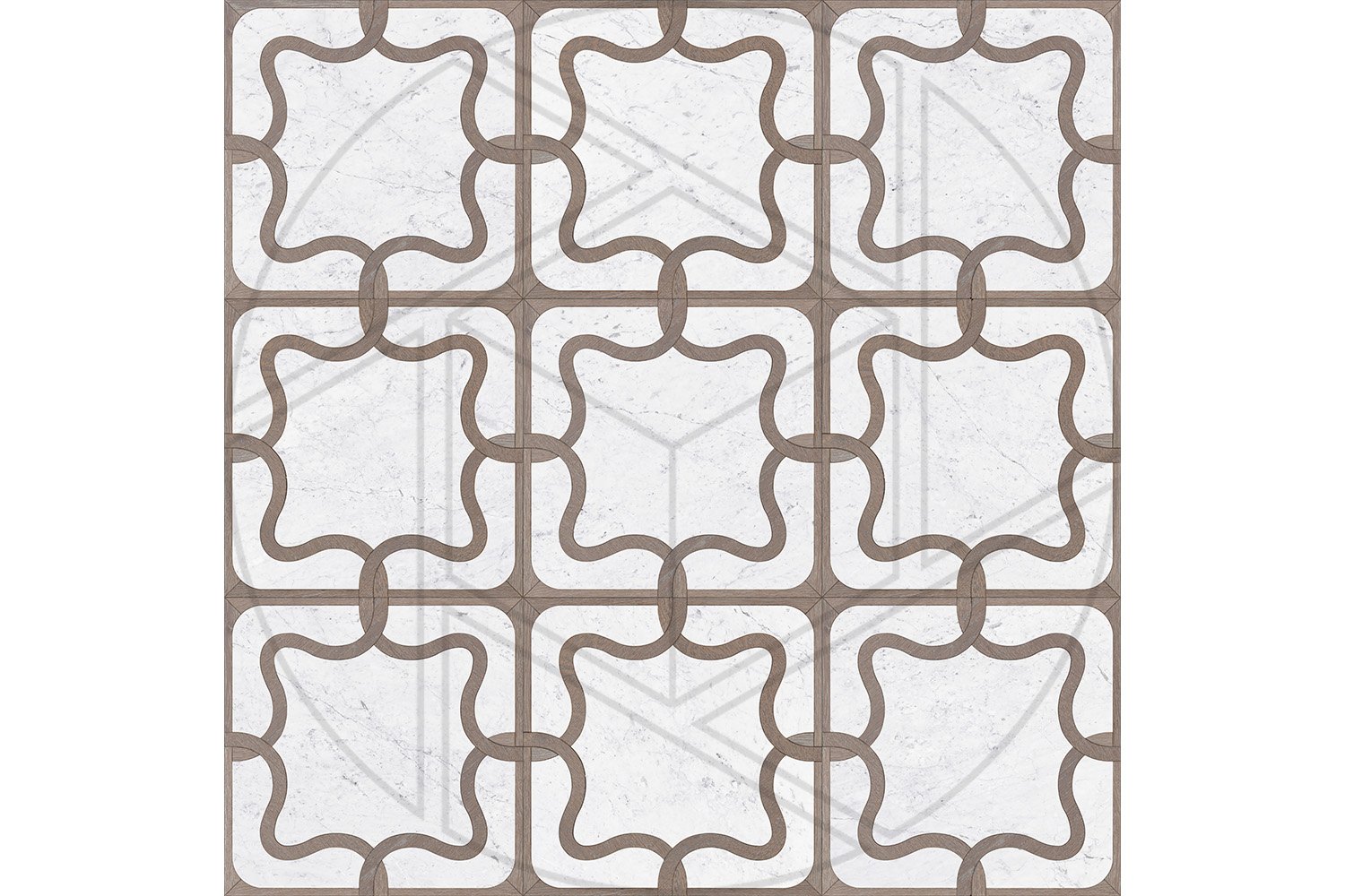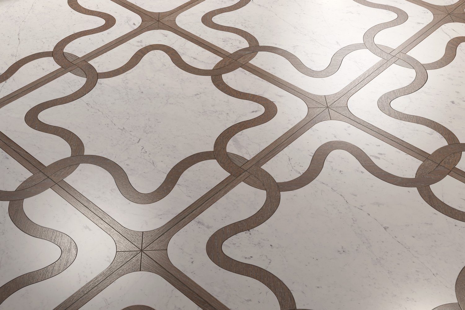 The “Firenze” design evokes the timeless elegance of Tuscan villas, where grace and distinction are woven into every detail. These square panels combine the purity of Carrara marble with the warmth of fine wood inlays, creating a striking interplay of materials that is at once classical and contemporary. The interlaced motif framed by wood recalls the prestige of historical Italian interiors, yet its clean geometry makes it equally suitable for modern, high-end spaces.
